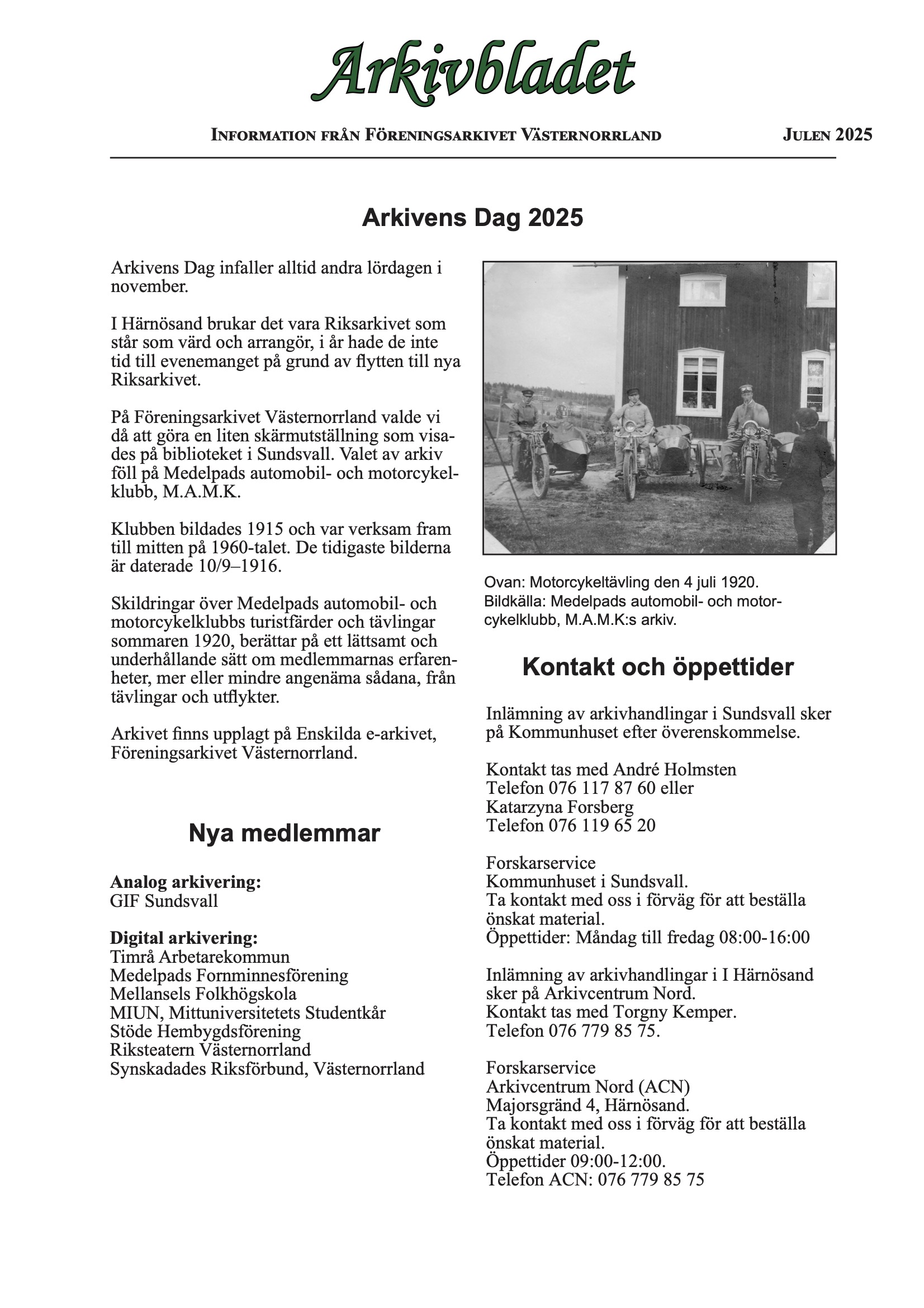 Föreningsarkivet Västernorrland har en medlemstidning som heter Arkivbladet. Där får medlemmarna läsa om intressanta nyheter på arkivfronten, vad som är på gång inom Föreningsarkivet Västernorrland och annat smått och gott.